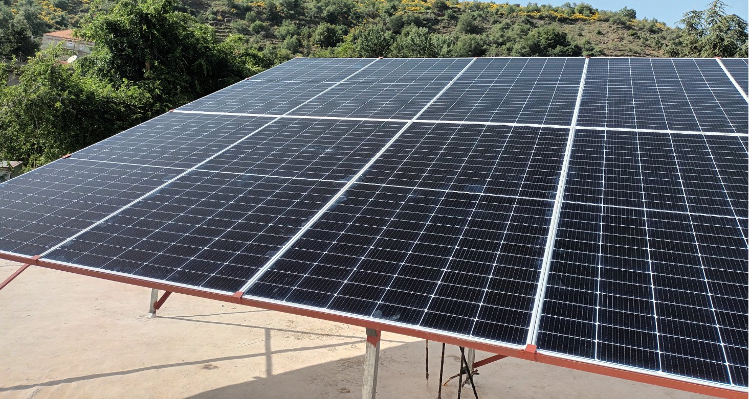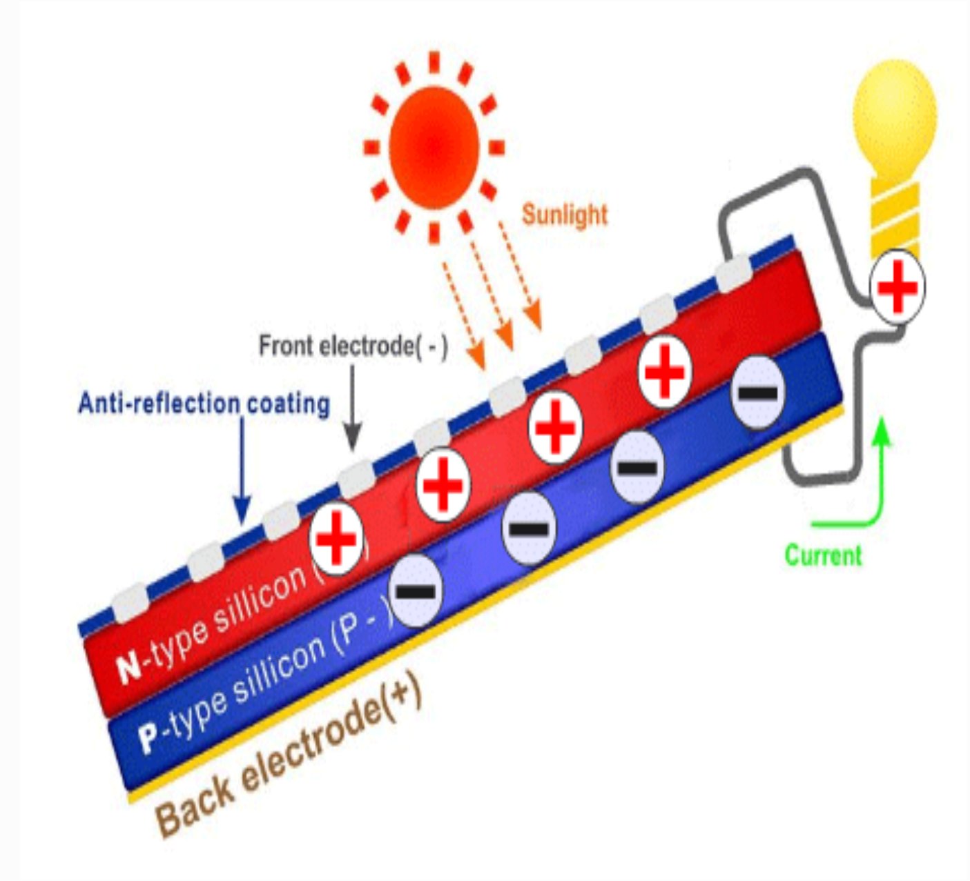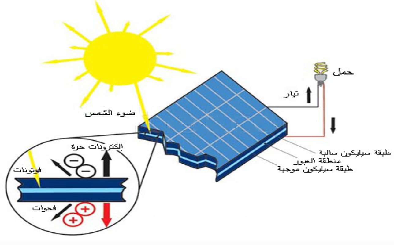عند تعرض الخلية الشمسية إلى أشعة الشمس ينتج بين طرفيها فرق جهد وتيار يمر عبرها إلى حمل كهربائي من أجل تشغيله