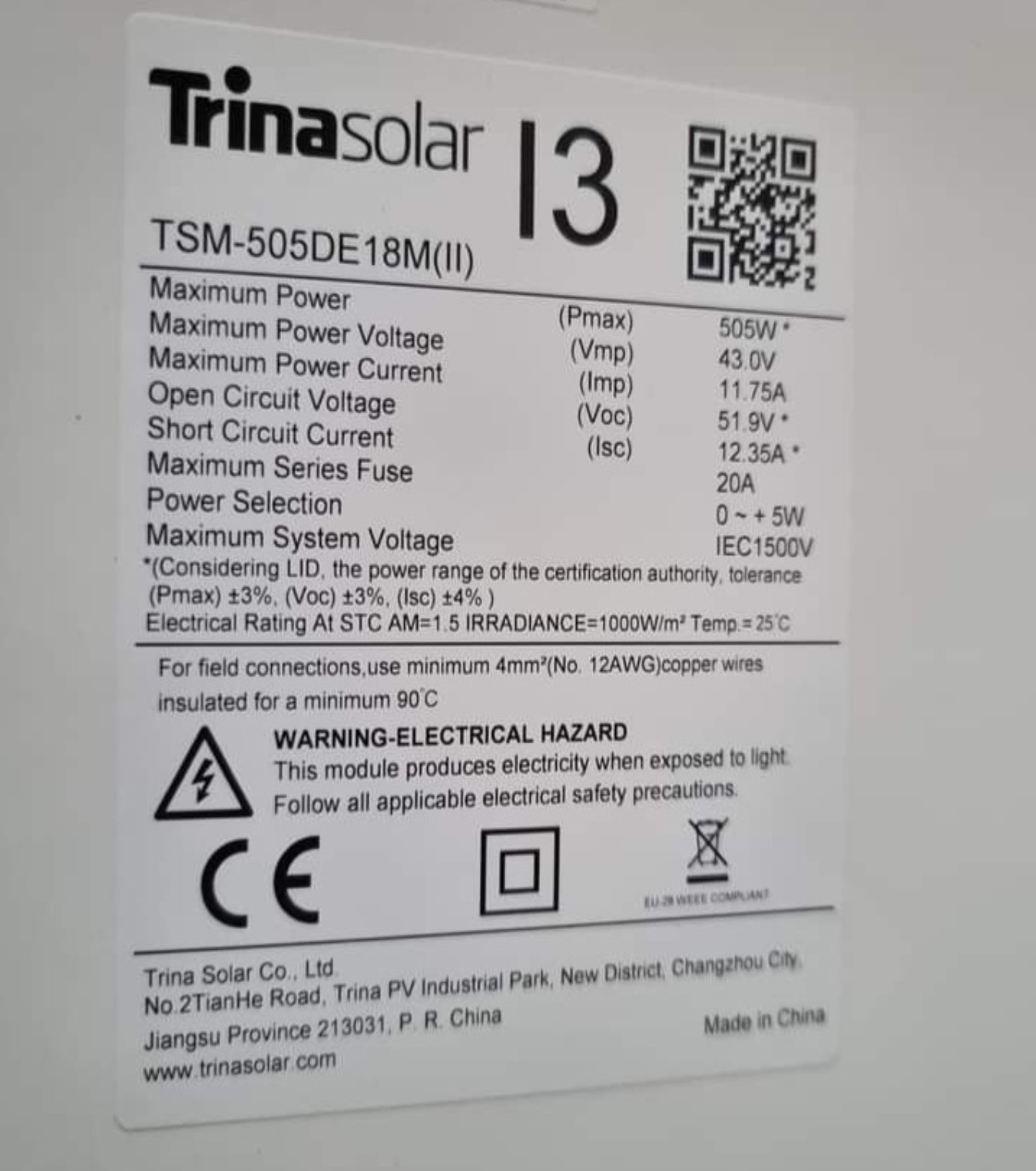- لوح شمسي ماركة ترينا Trina solar panel Maximum Power (Pmax) 505W