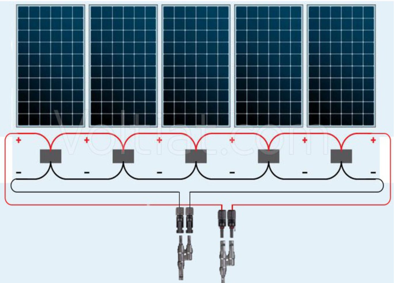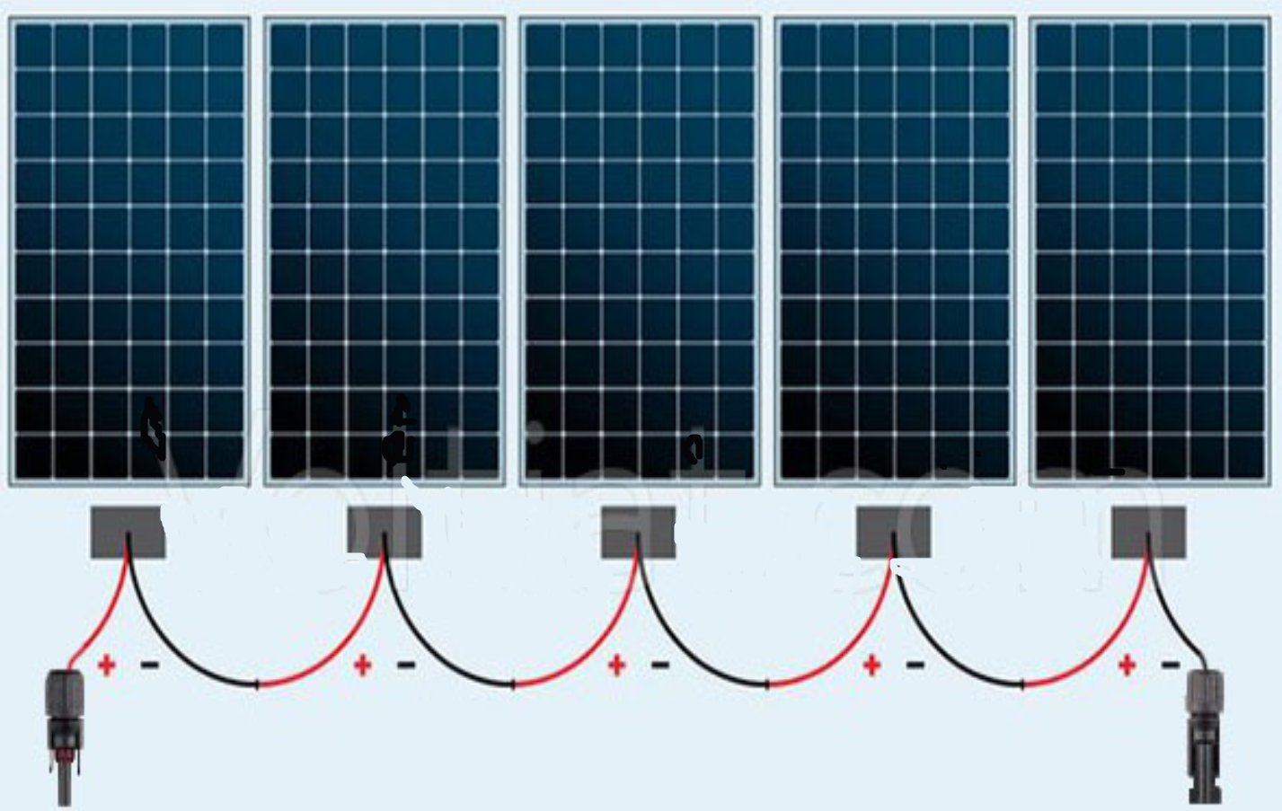 توصيل الألواح على التوالي Series يتم فيها ربط الطرف الموجب للوح الشمسي مع الطرف السالب للوح المقابل باستخدام وصلات الـ MC4
