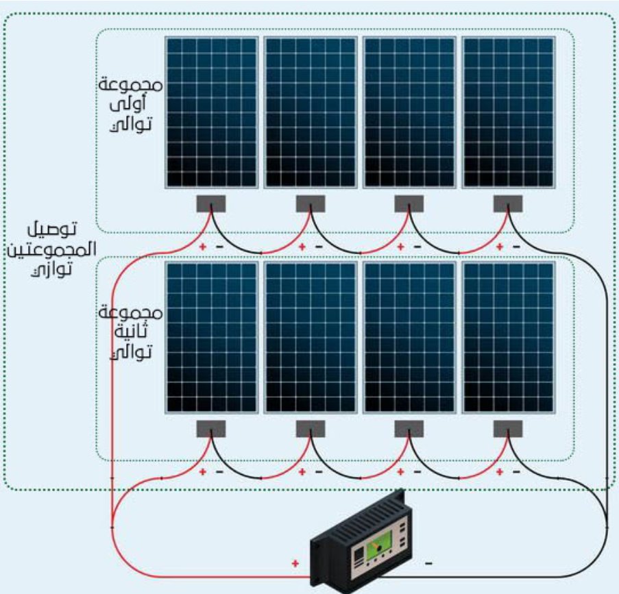 يتم فيها ربط عدة ألواح على التوالي بوصل الطرف الموجب للوح الأول مع الطرف السالب للوح الثاني وهكذا وتسمى المجموعة الأولى ثم توصل على التوازي مع مجموعة ثانية بنفس عدد الألواح المتصلة على التوالي في المجموعة الأولى مجموعة أولى توالي مجموعة ثانية توالي توصيل المجموعتين توازي